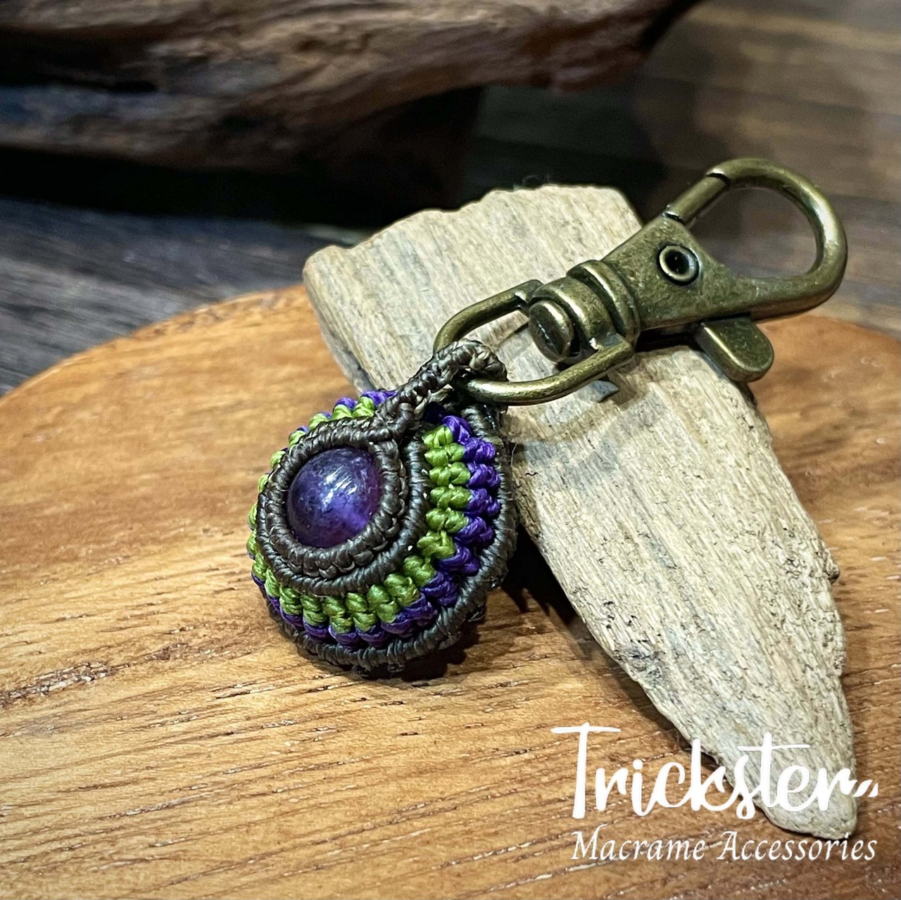 アメジストを丁寧に編み込んだマクラメチャームです。
