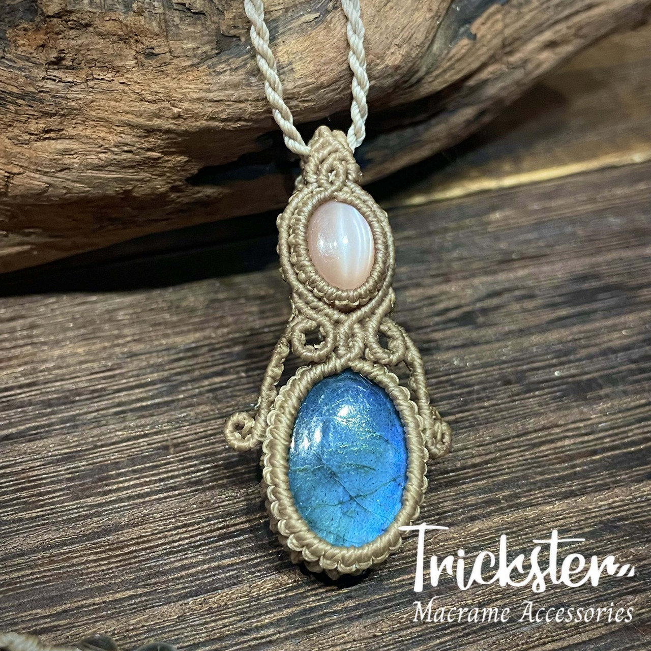 青色のラブラドライトとムーンストーンを組み合わせたペンダントは