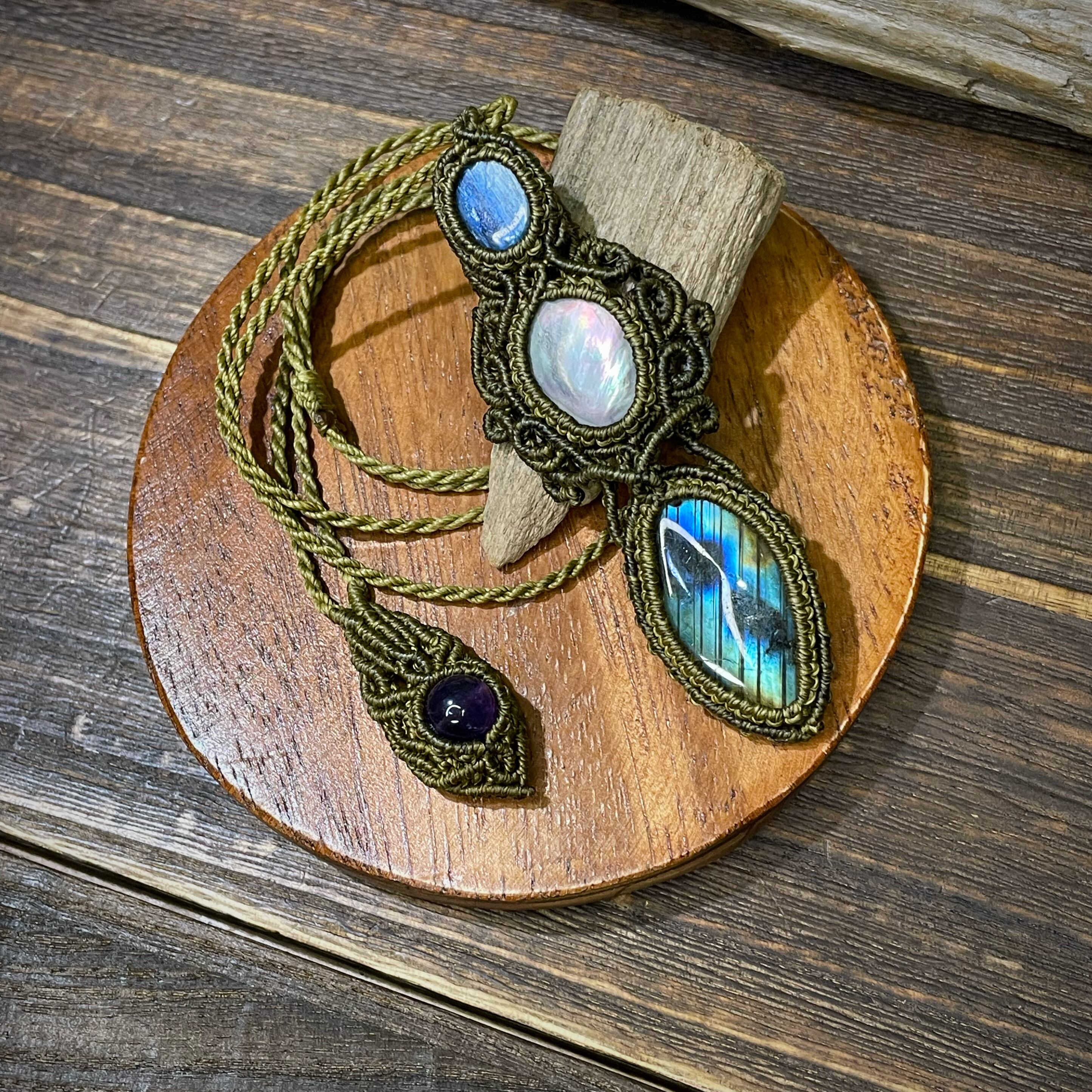ラブラドライト、黒蝶貝、カイヤナイトを使用したマクラメペンダントです✩.*˚