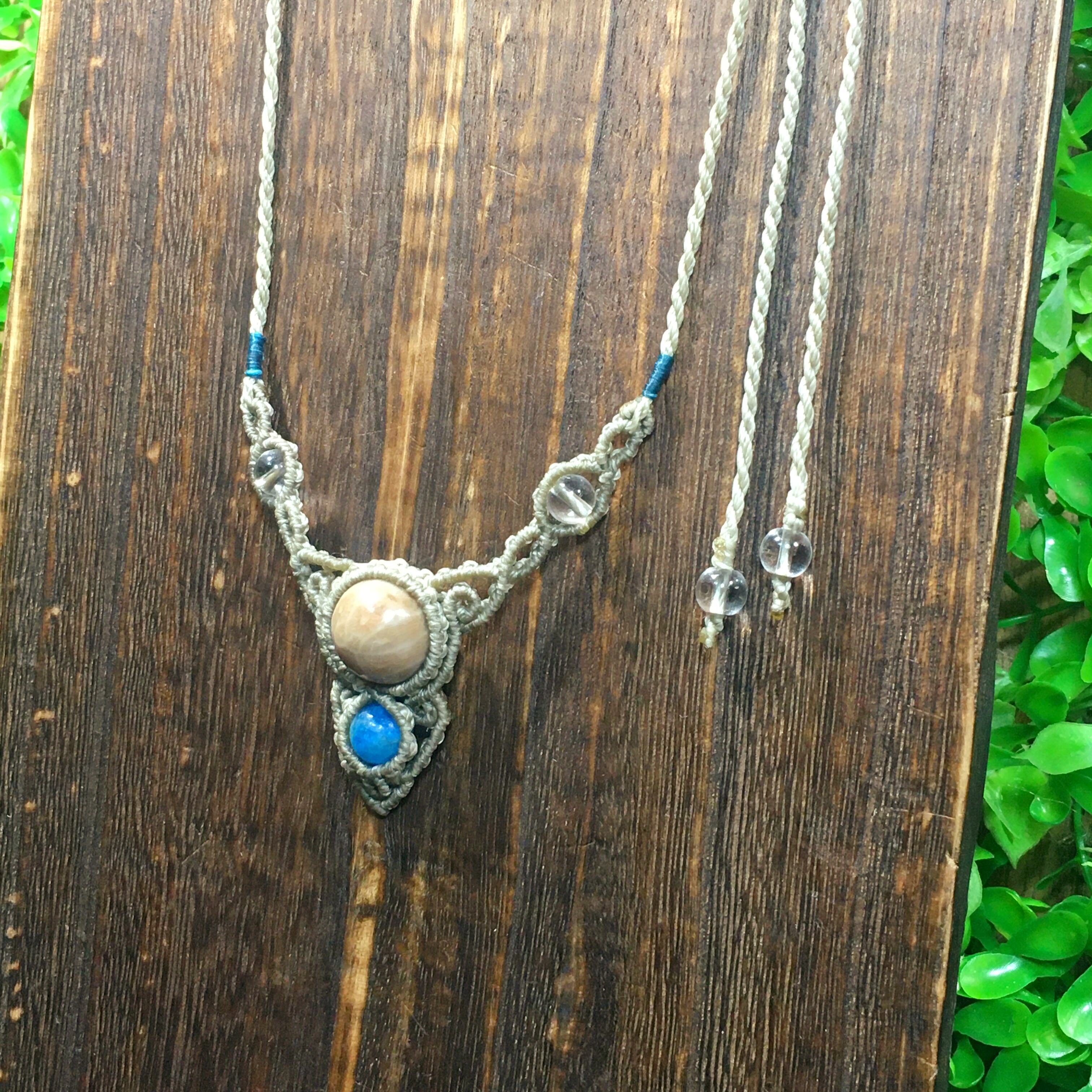 フォシルコーラル、アパタイト、クォーツを使用したマクラメペンダントです✩.*˚