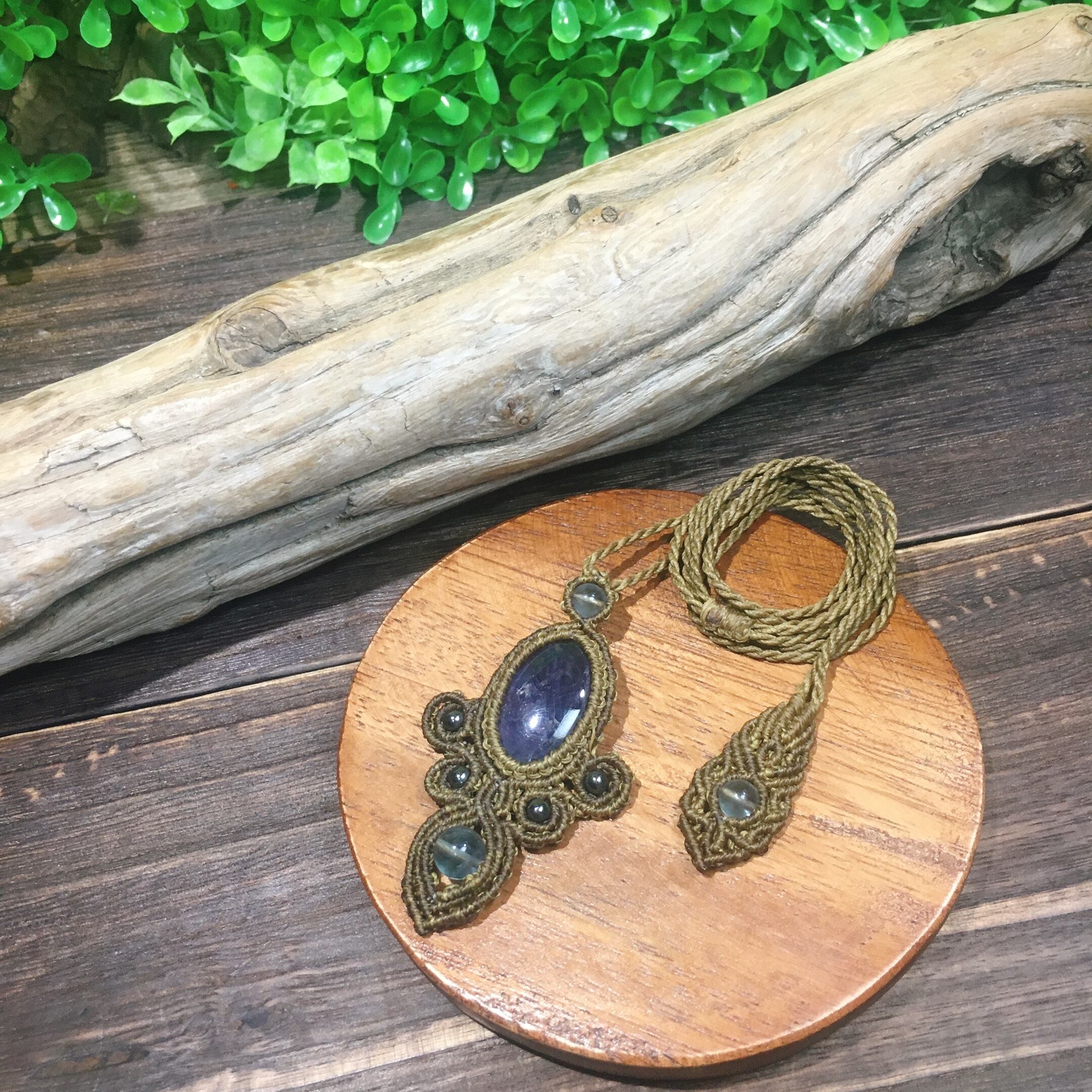 アイオライト、ブルーフローライト、ヘマタイトを使用したマクラメペンダントです。