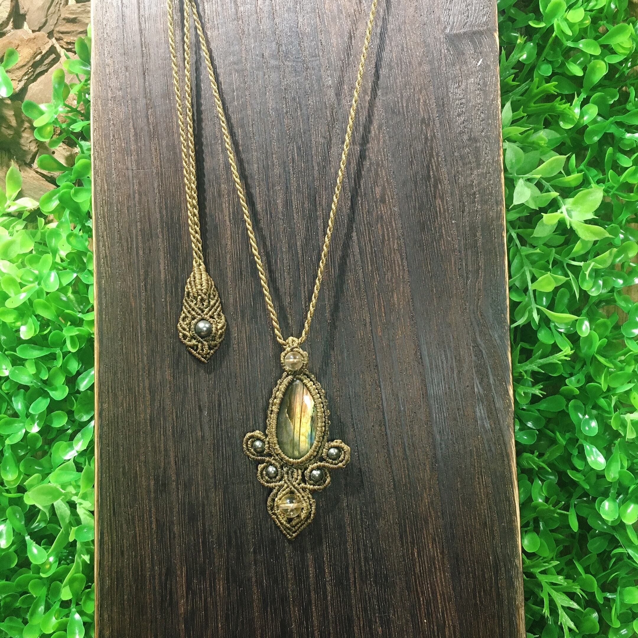 ラブラドライト、シトリンパイライトを使用したマクラメペンダントです。