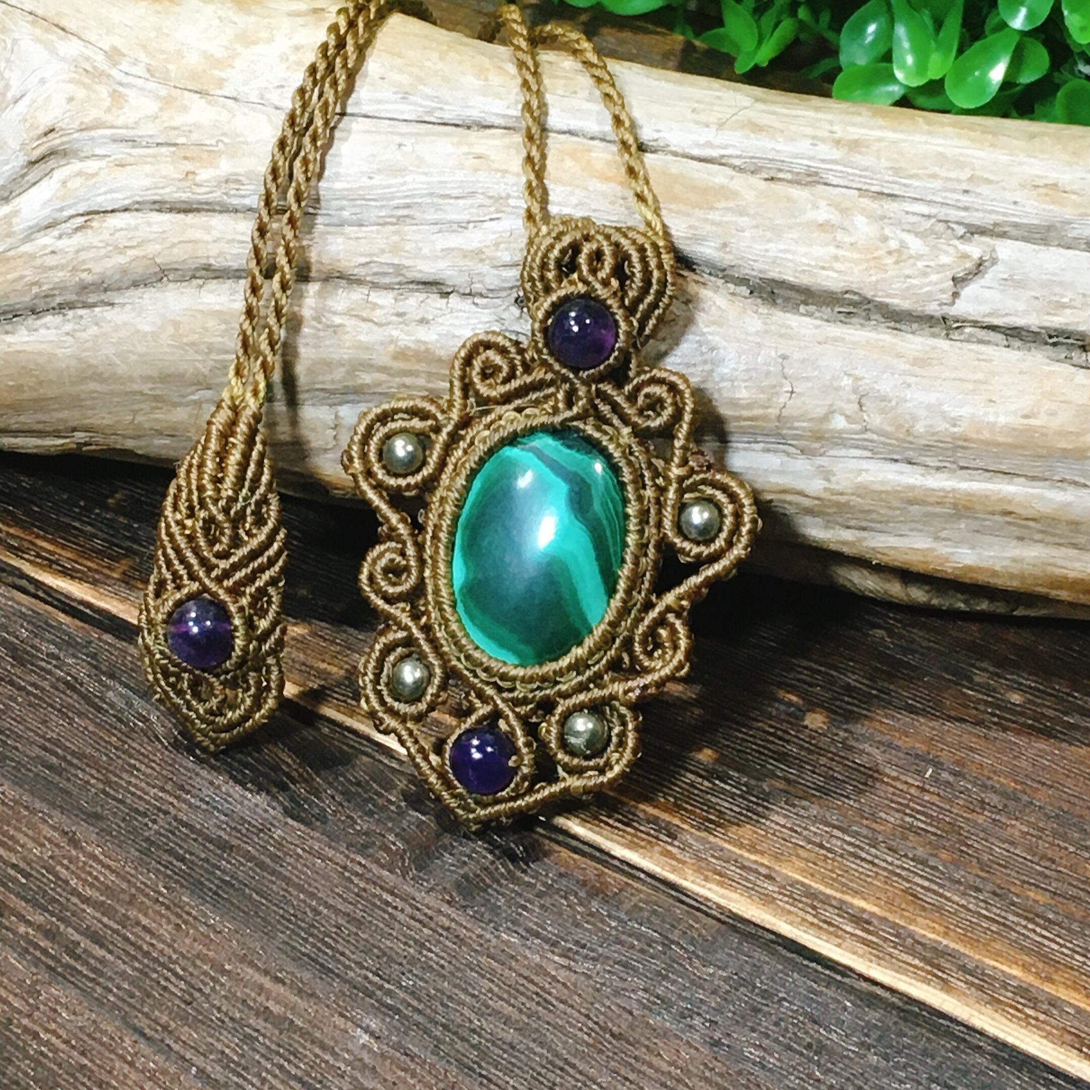 マラカイト、アメジスト、パイライトを使用したマクラメペンダントです。