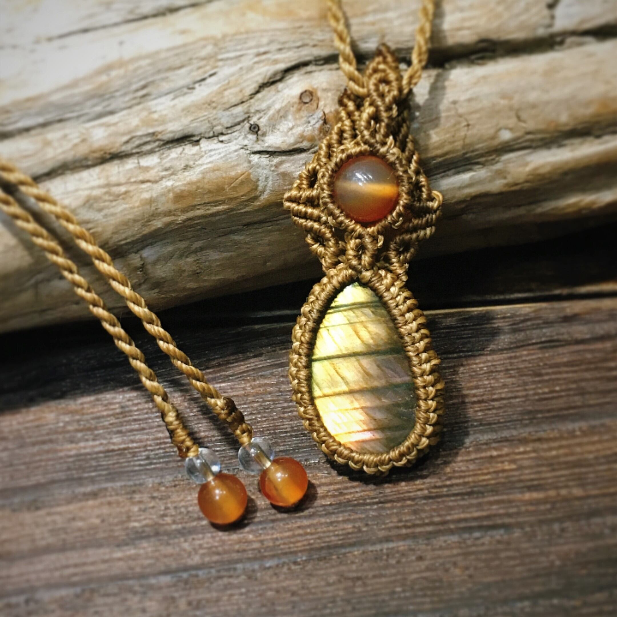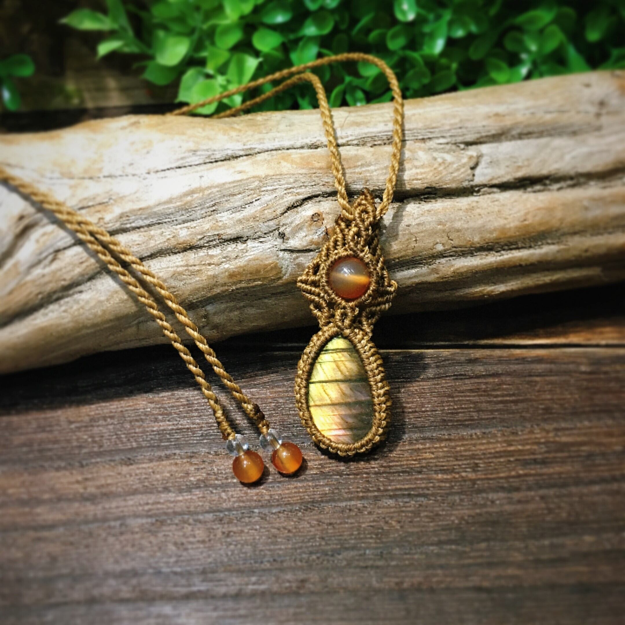 ラブラドライトとカーネリアンを使用したマクラメペンダントです。