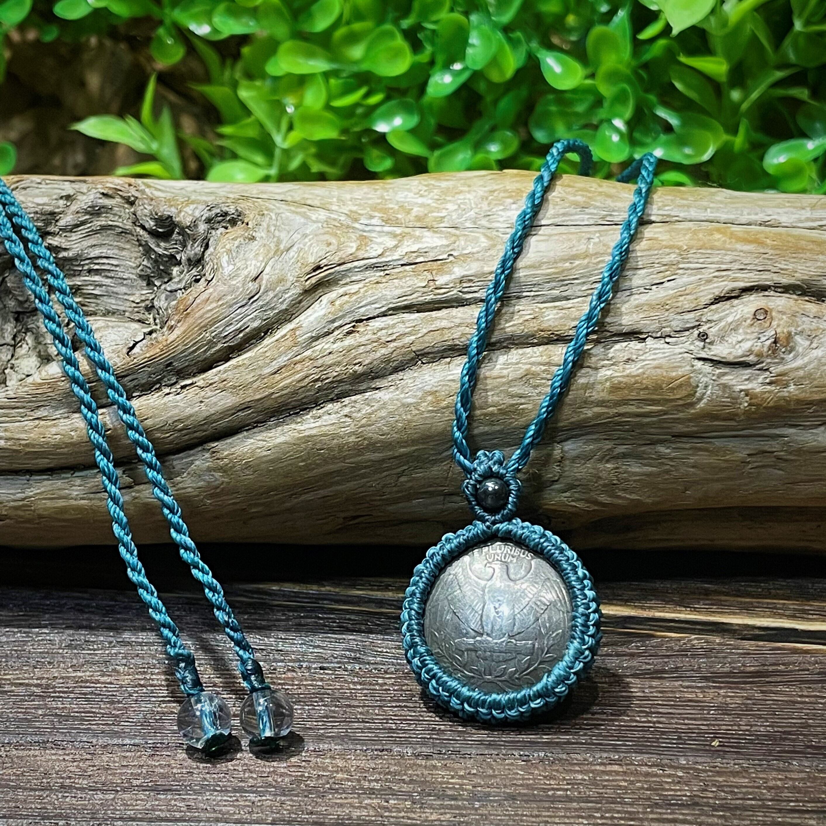 25セントコインを使用したマクラメペンダントです。
