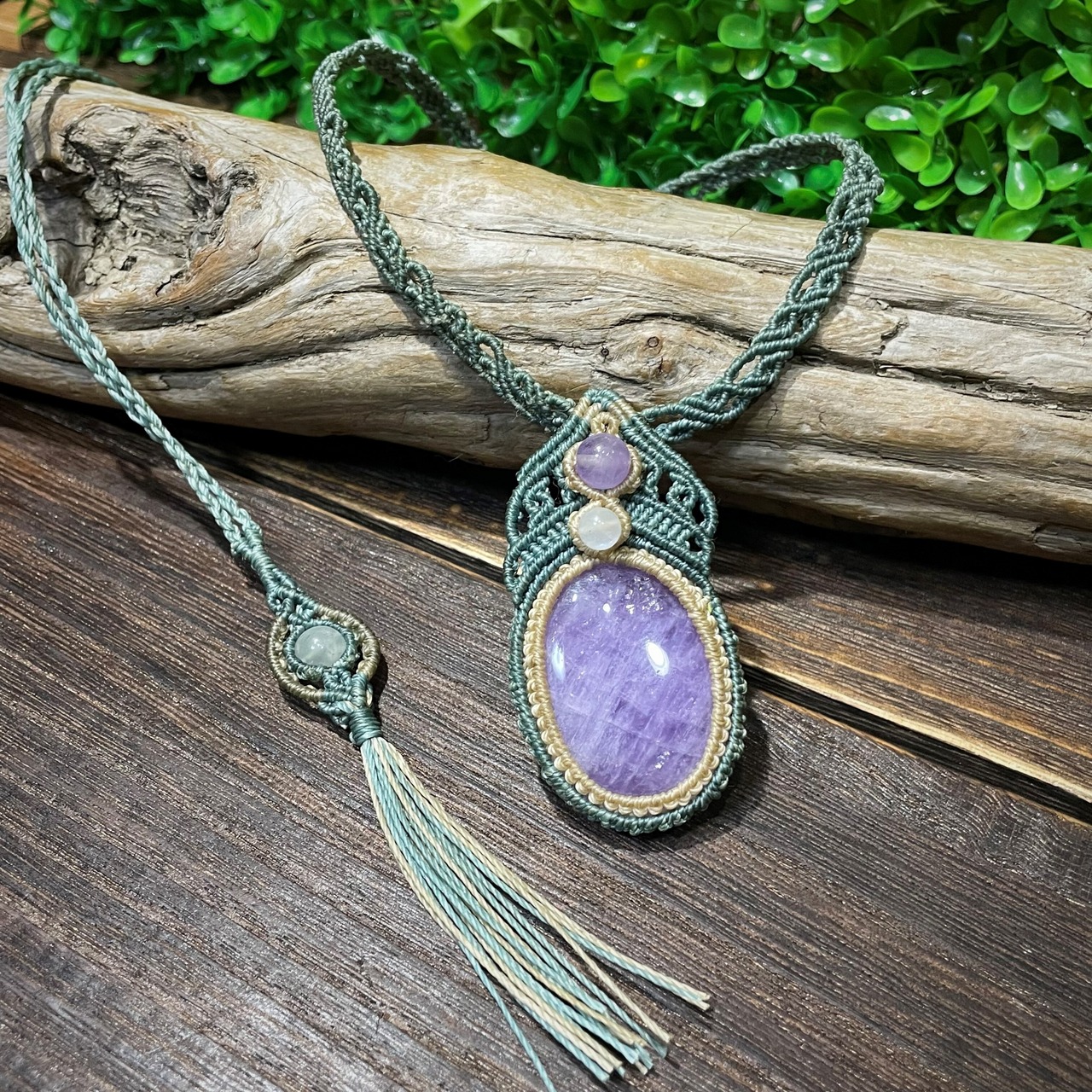 ラベンダーアメジストとムーンストーンを使用したマクラメペンダントです。