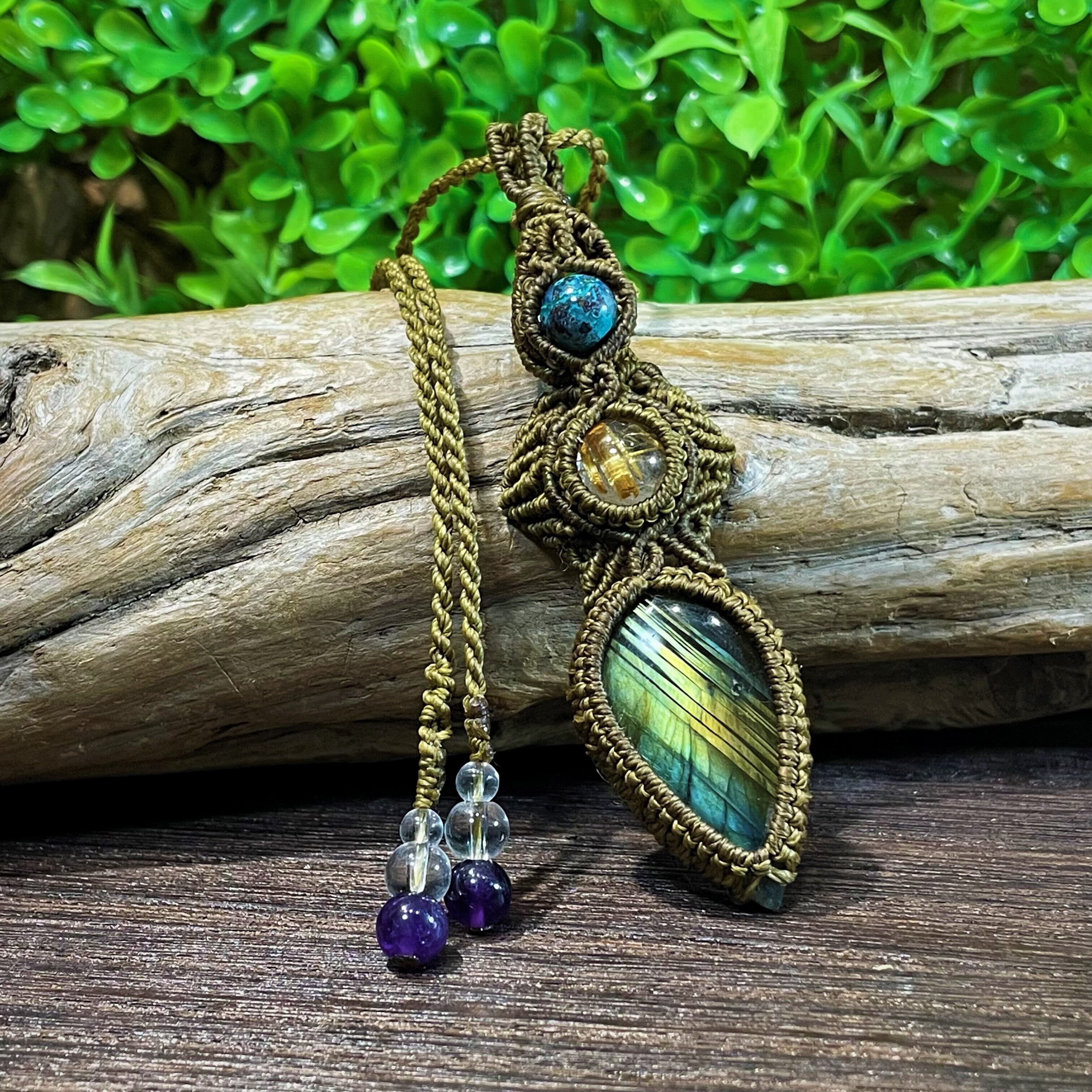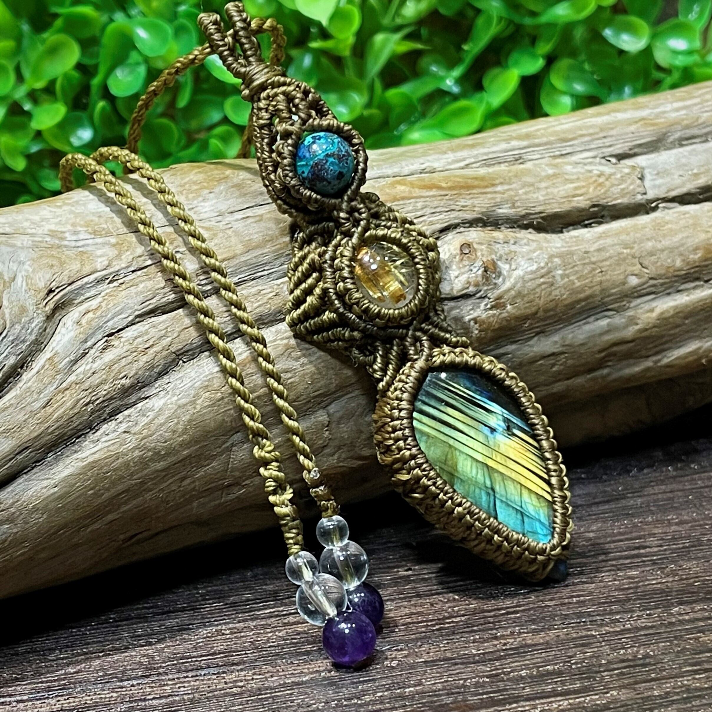 ラブラドライト、ルチルクォーツ、クリソコラを使用したマクラメペンダントです。