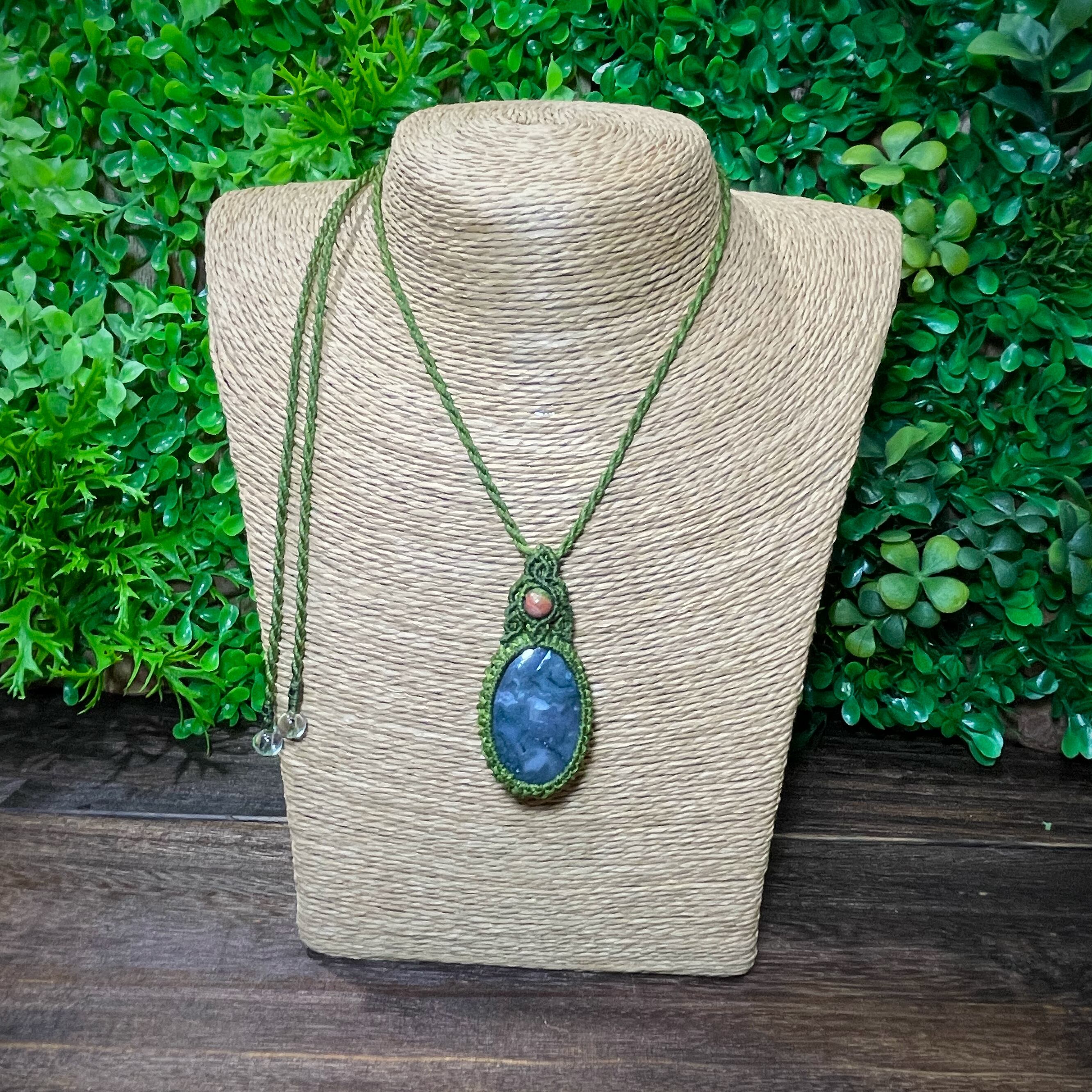 モスアゲートとユナカイトを使用したマクラメペンダントです。