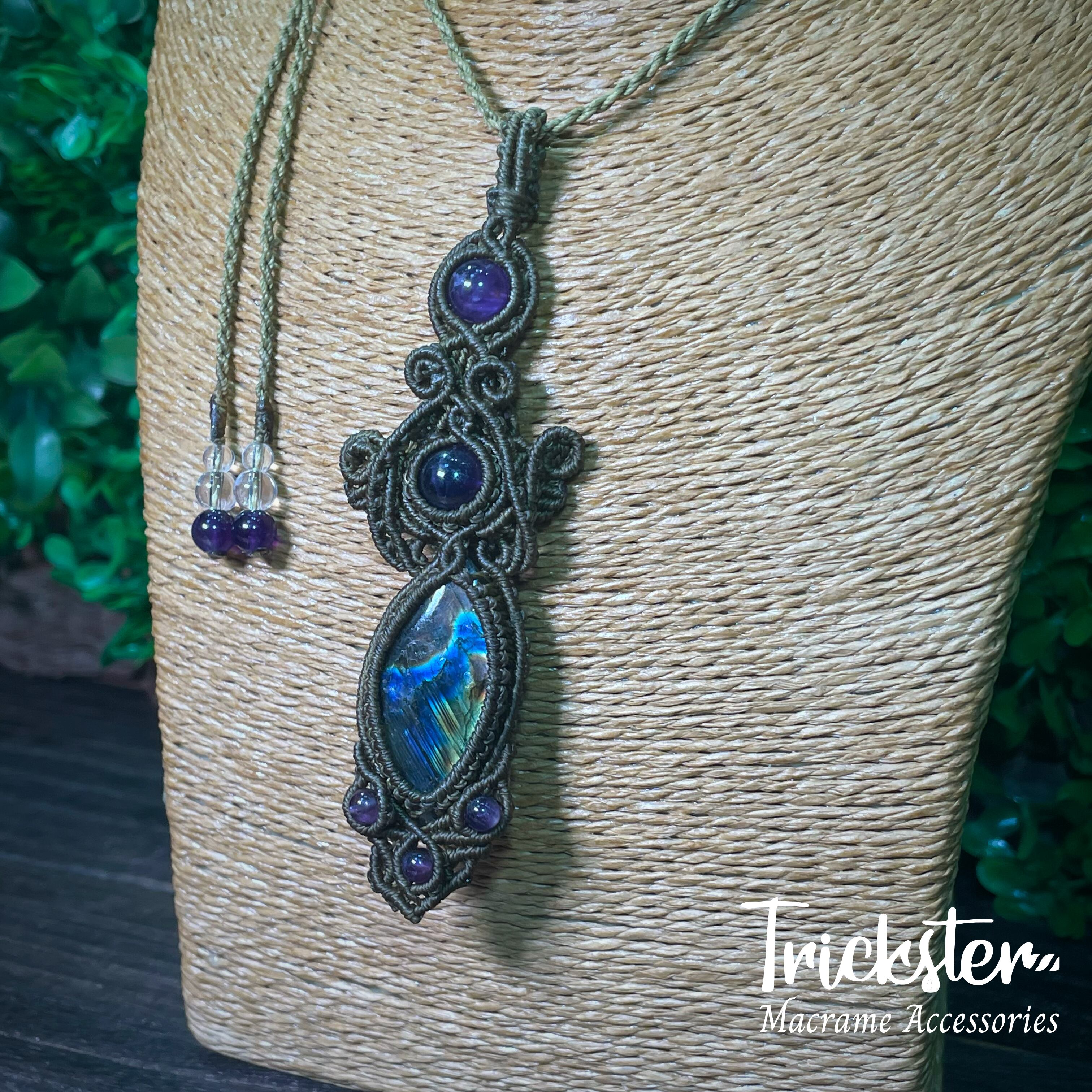 ラブラドライト、アメジストを使用したマクラメペンダントです。