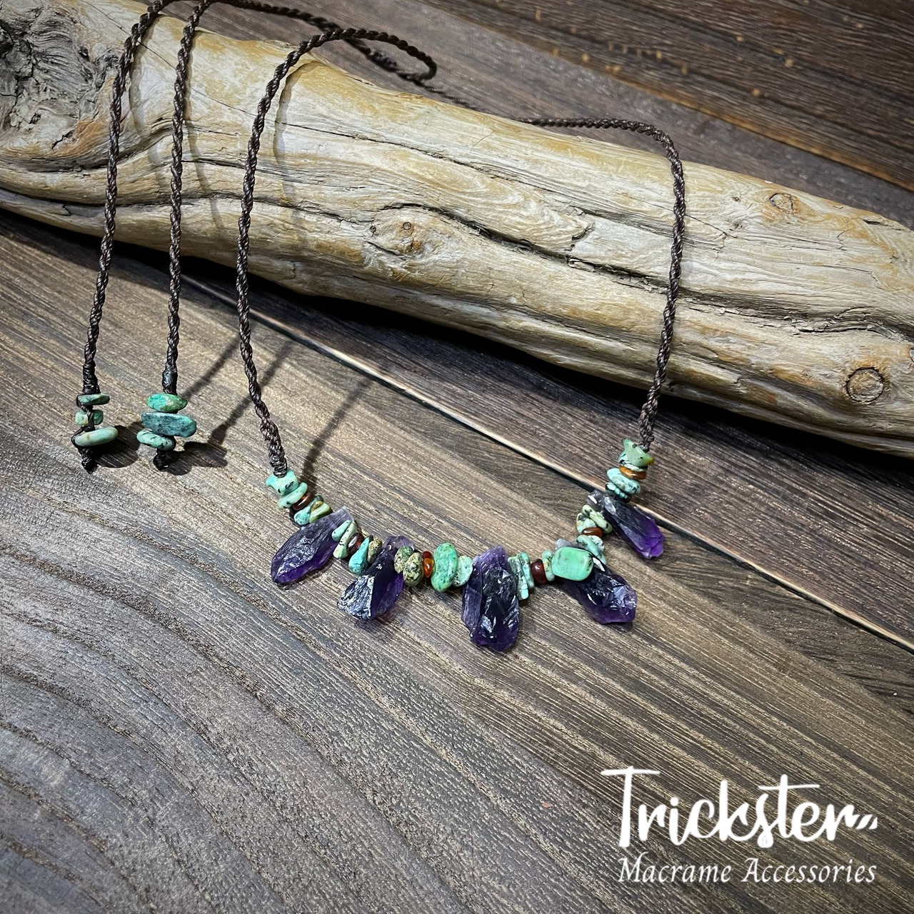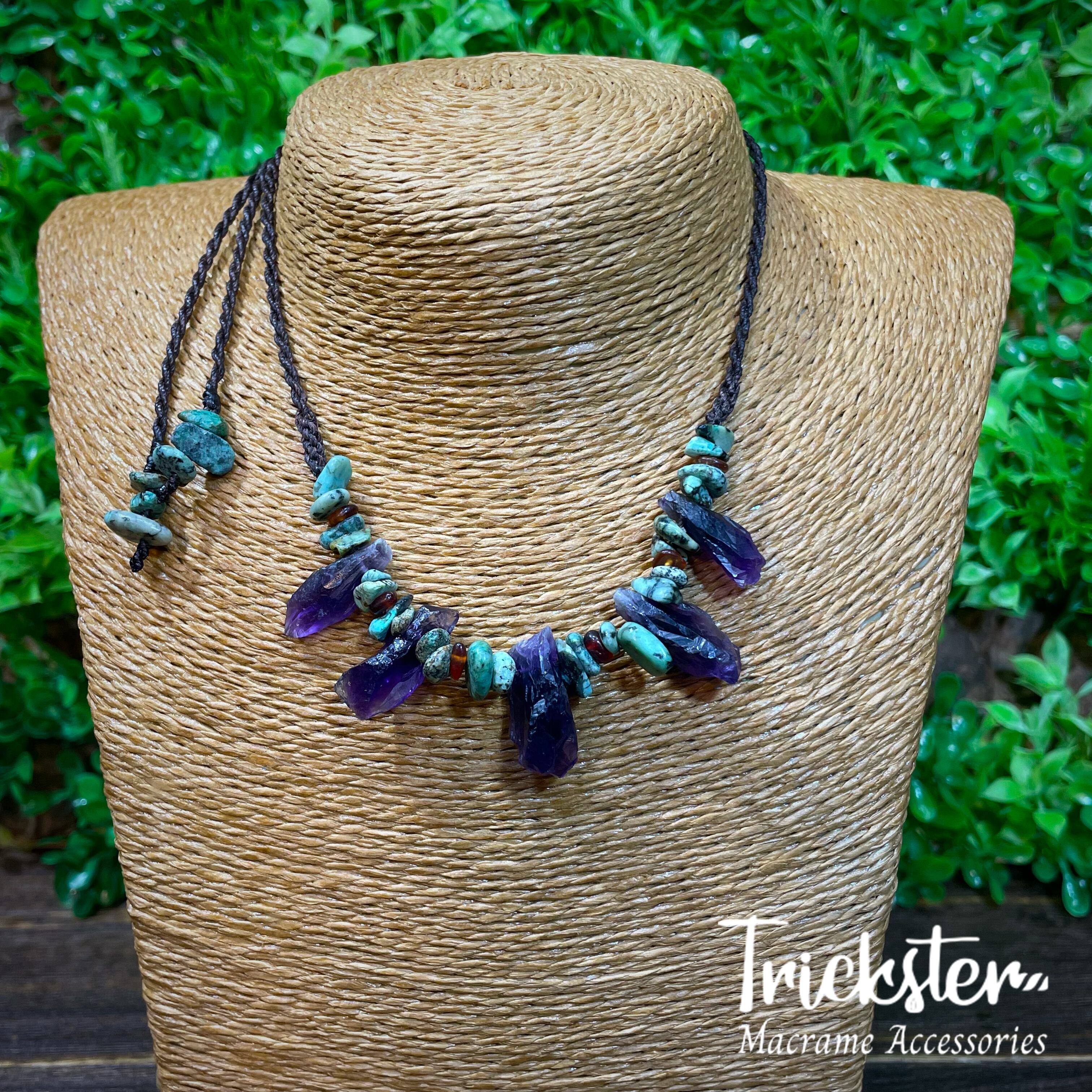 アメジスト、アフリカンターコイズ、ヘソナイトを使用したマクラメペンダントです。