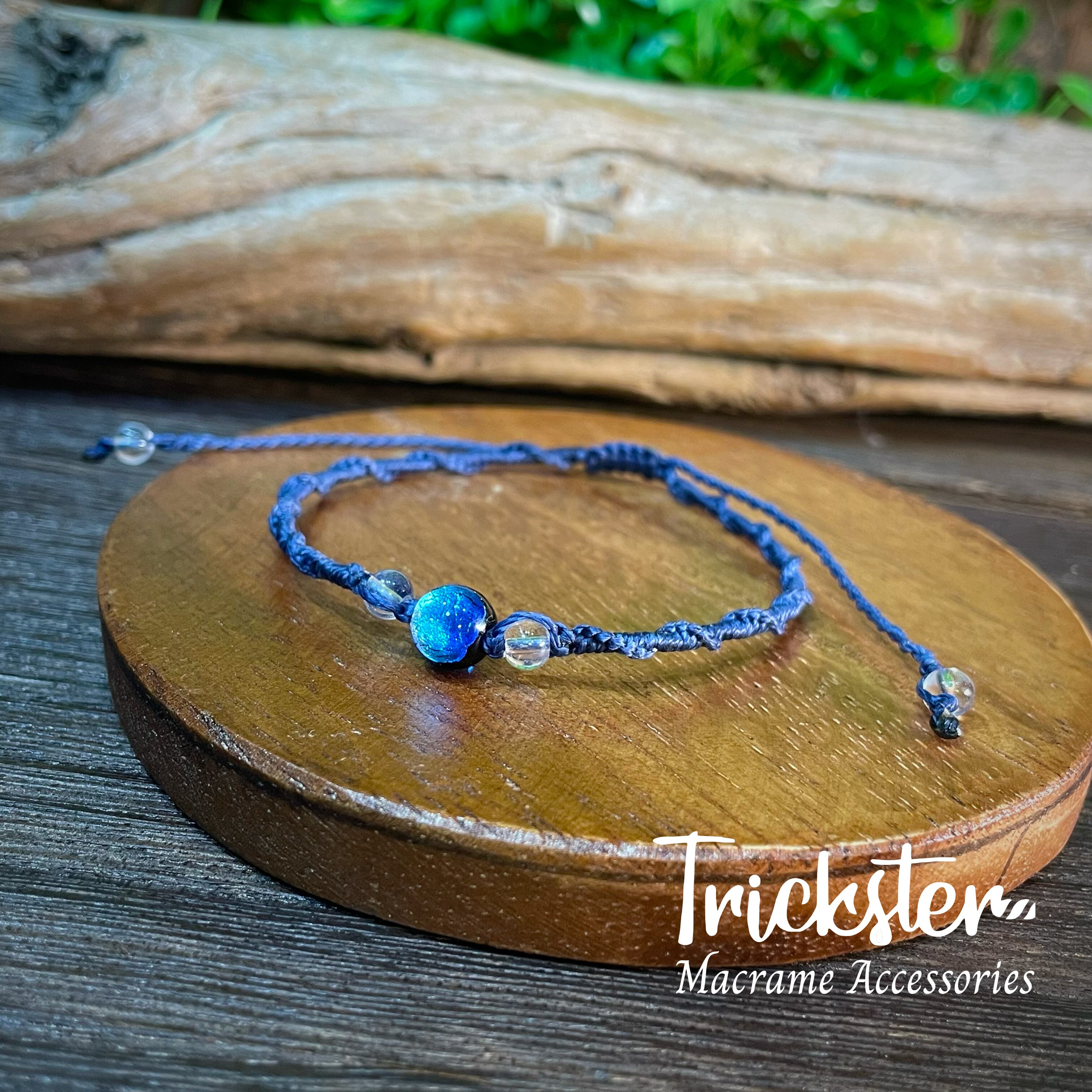 ホタルガラスとクォーツを使用したマクラメブレスレットです。