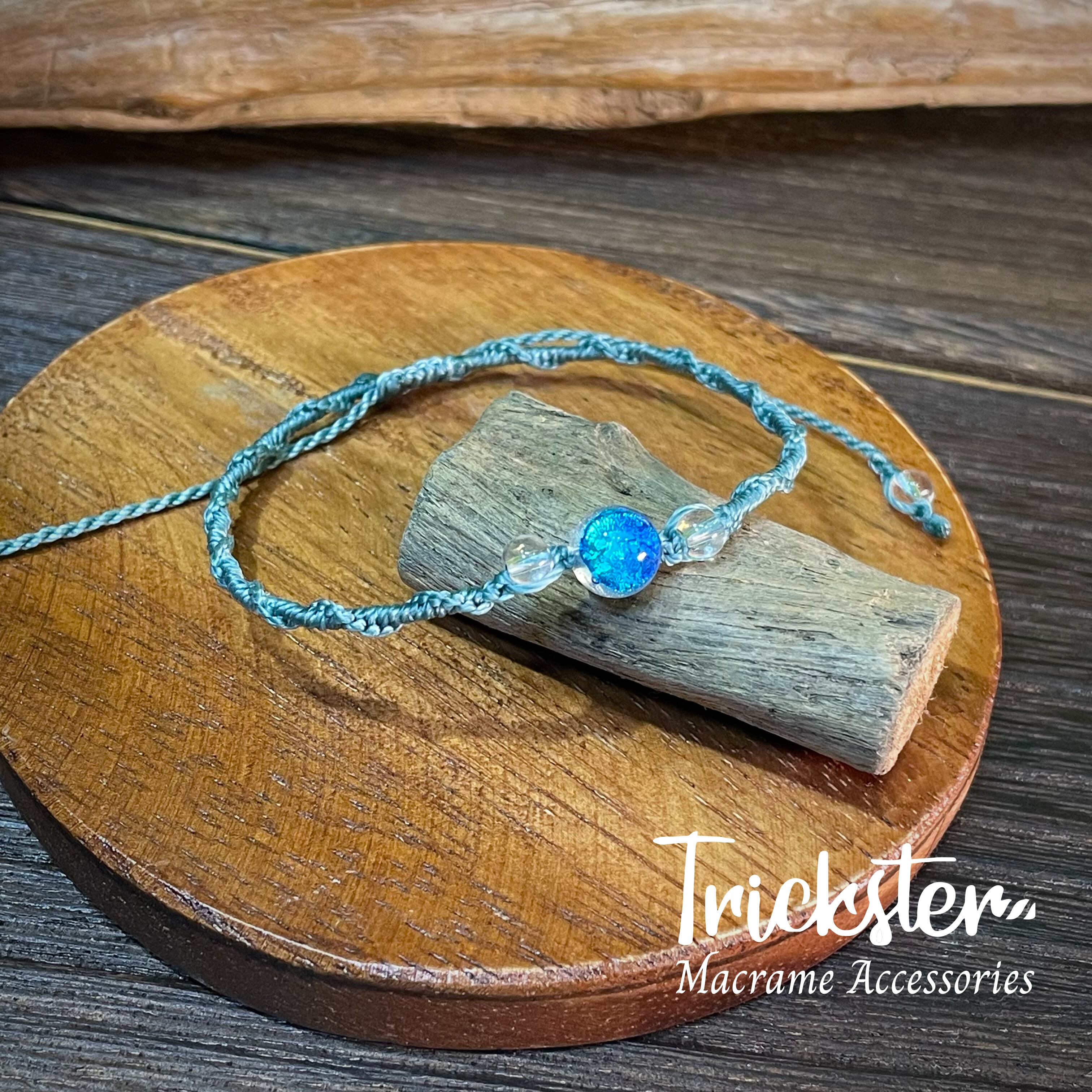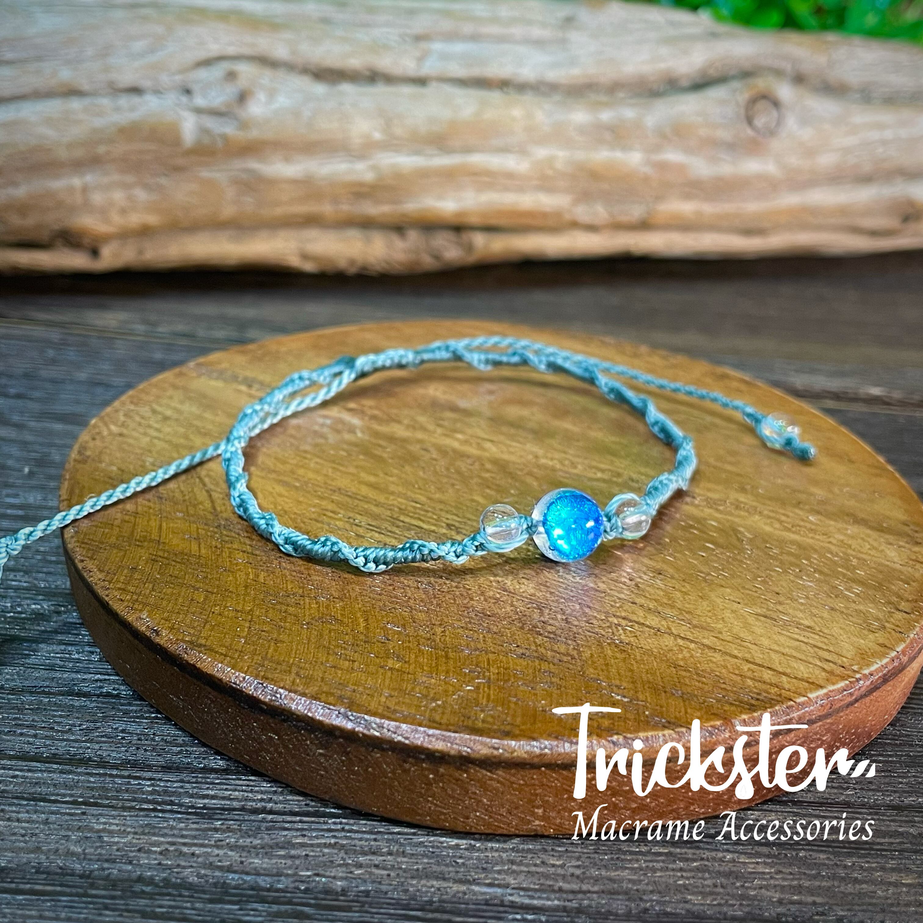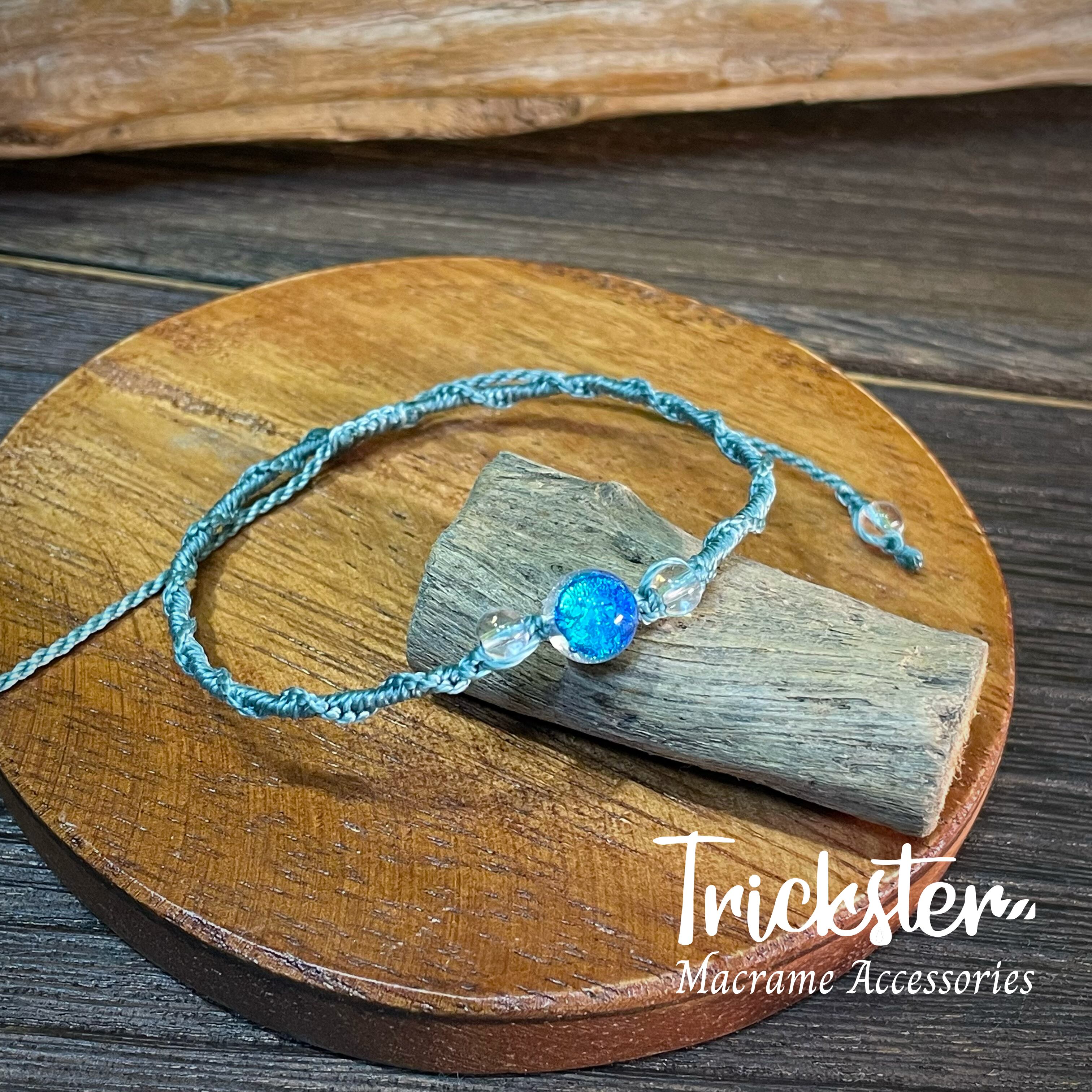 ホタルガラスとクォーツを使用したマクラメブレスレットです。