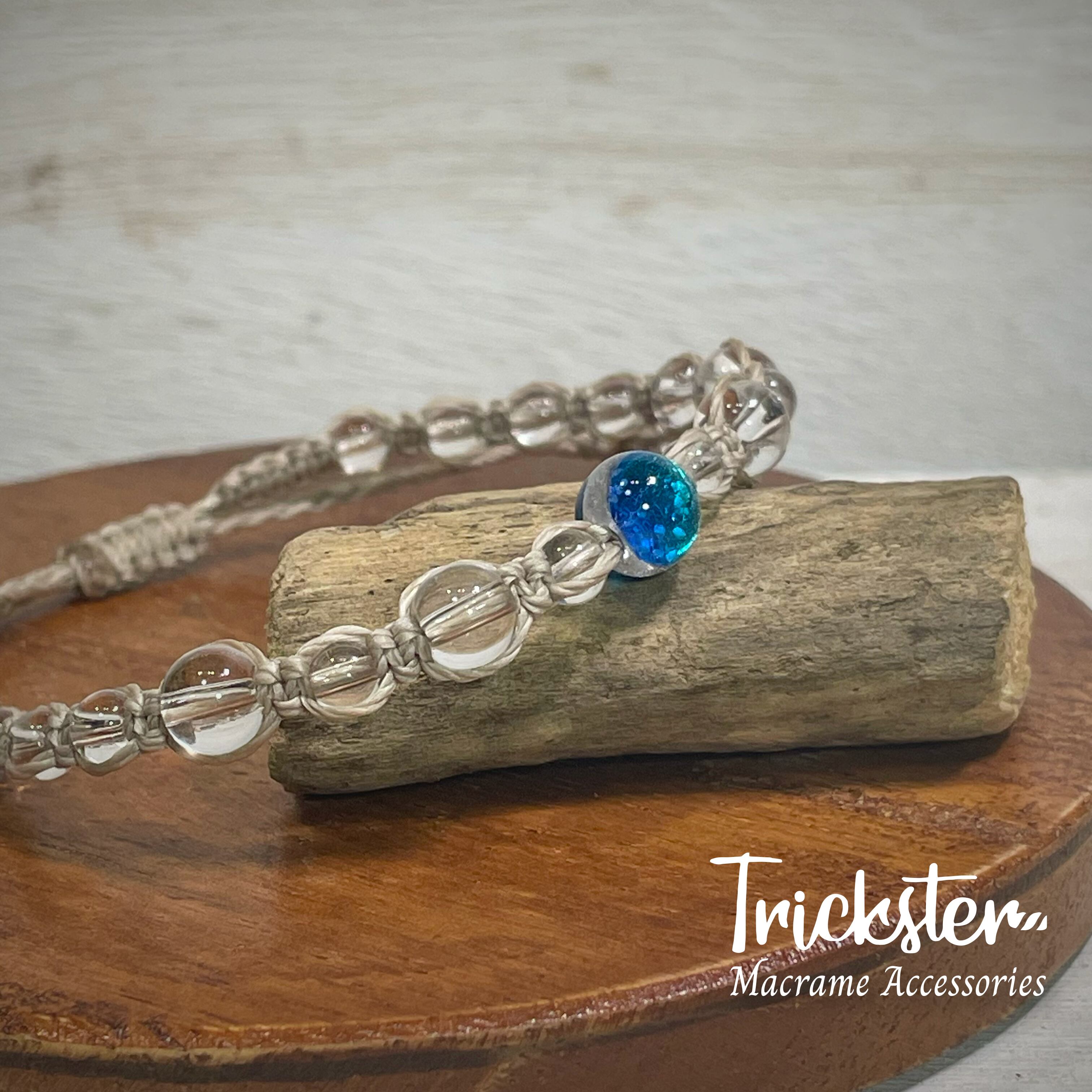 ホタルガラスとクォーツを使用したマクラメブレスレットです。