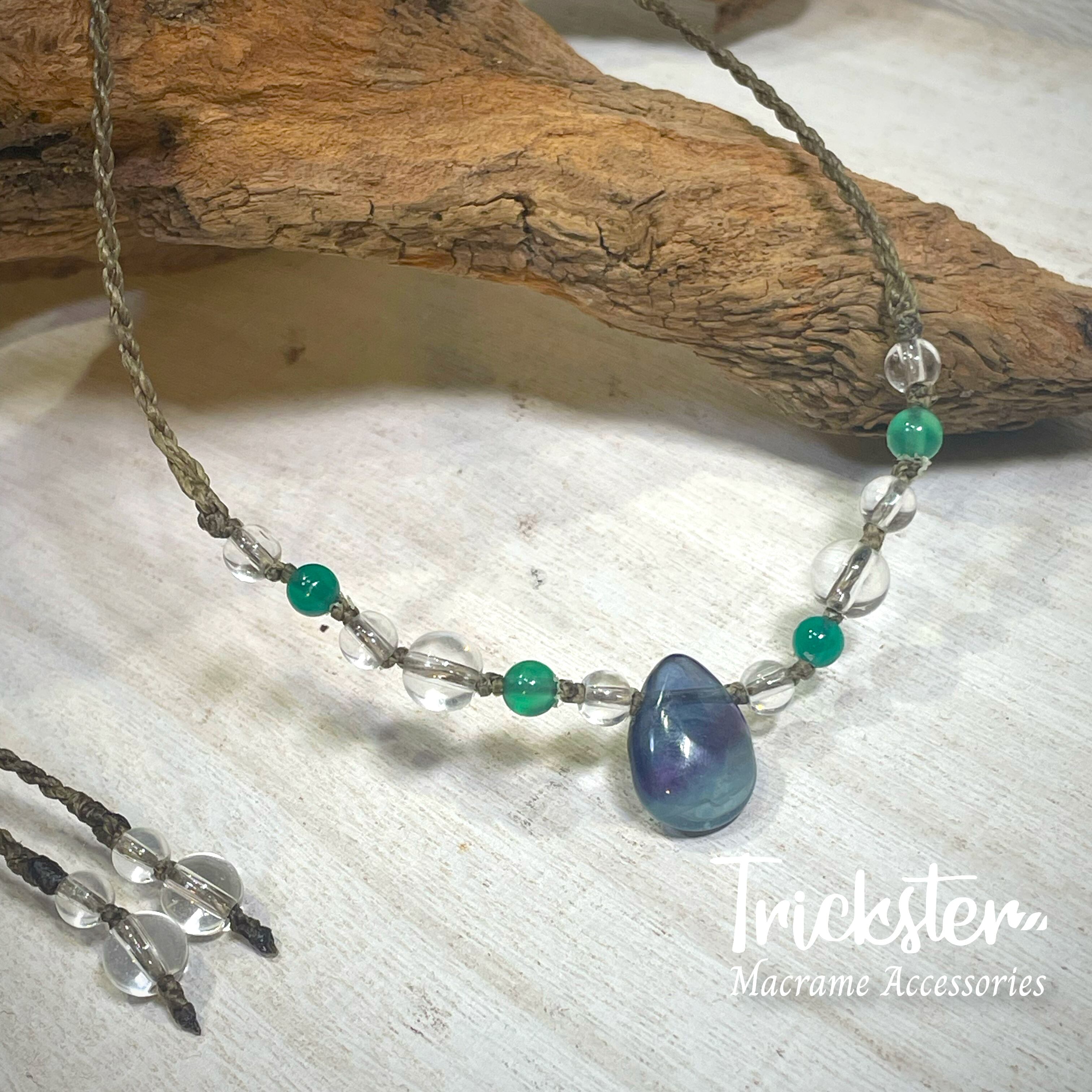 フローライト、グリーンオニキスを使用したマクラメペンダントです。