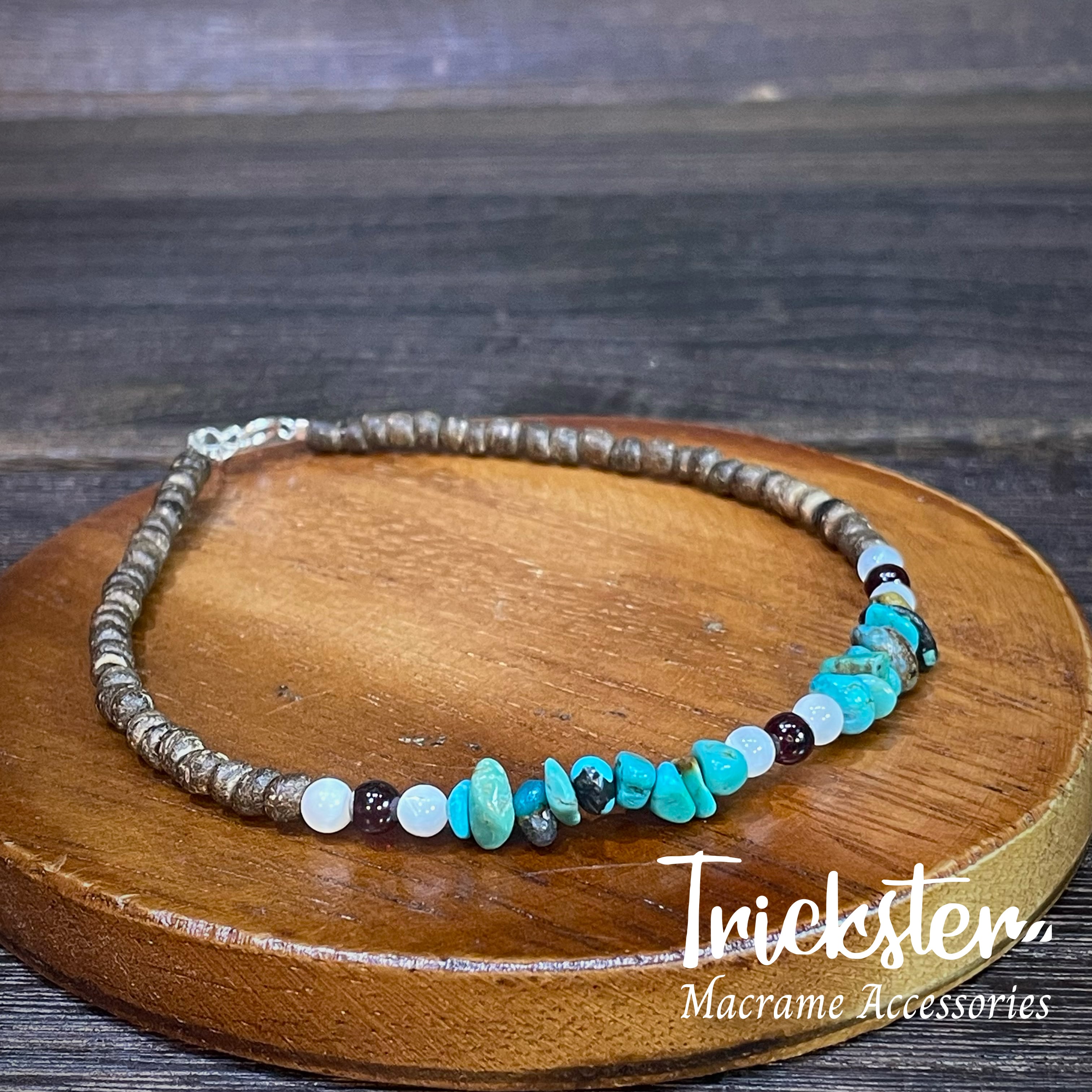 ターコイズ、マザーオブパール、ココナッツビーズを使用したブレスレット、アンクレットです。