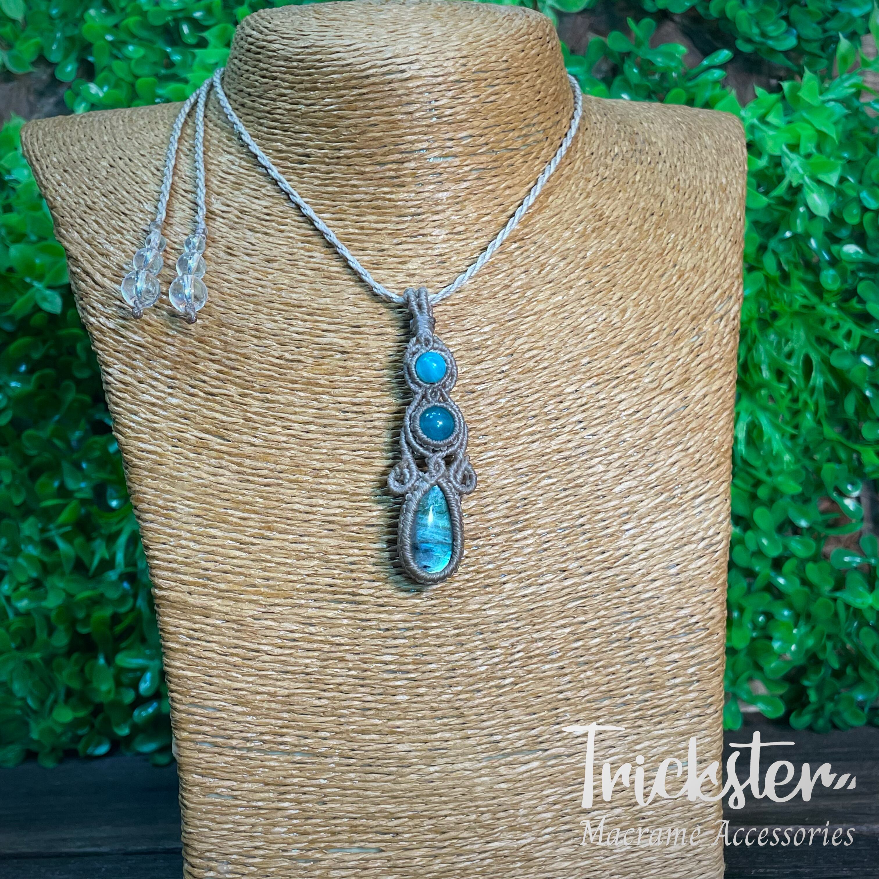 ラブラドライト、アマゾナイトシリカを使用したマクラメペンダントです。