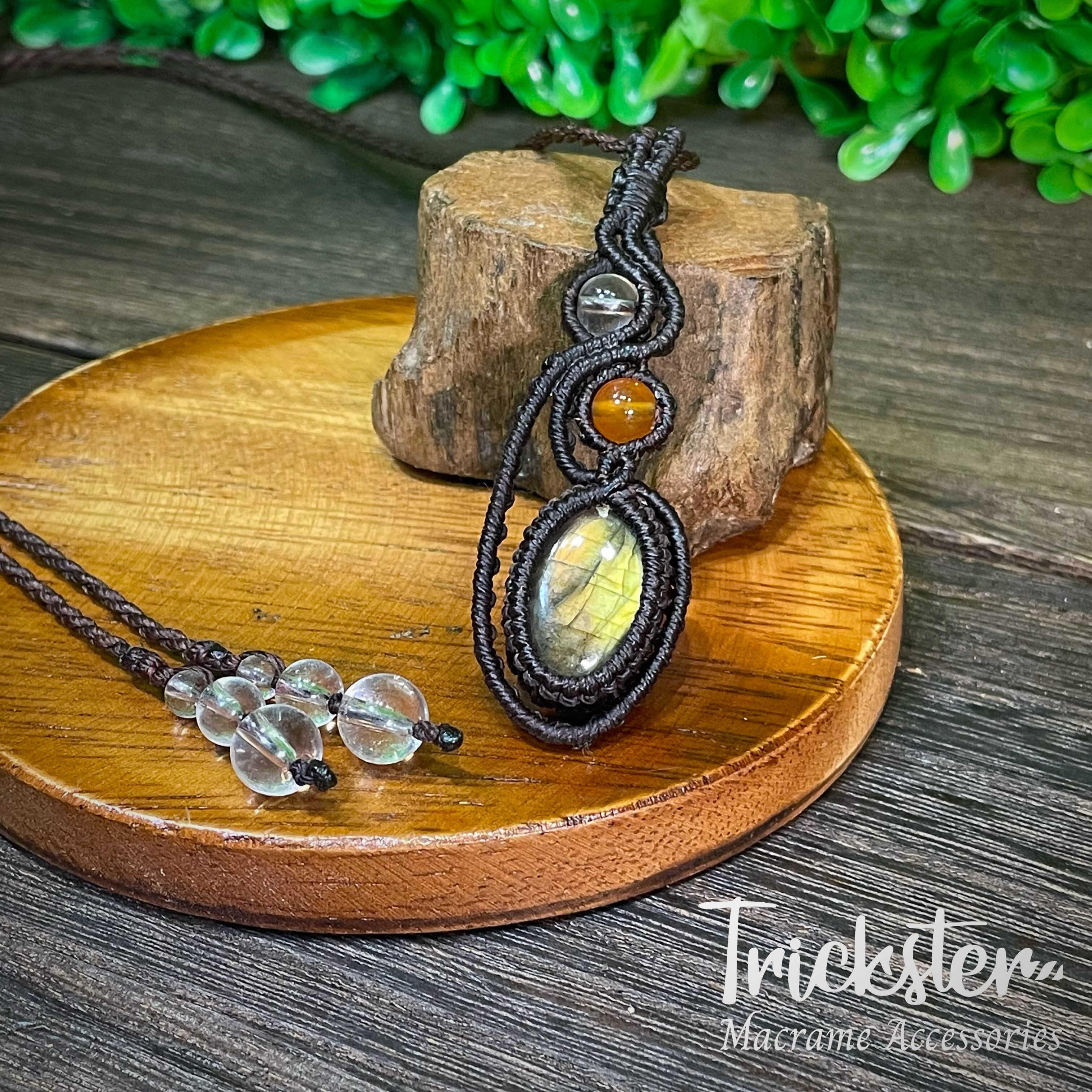 ラブラドライト、カーネリアン、クォーツを使用したマクラメペンダントです。