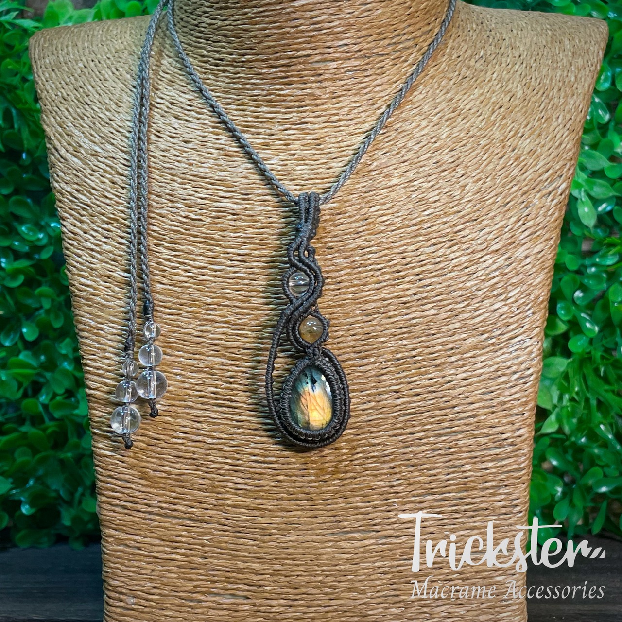 ラブラドライト、シトリン、クォーツを使用したマクラメペンダントです。