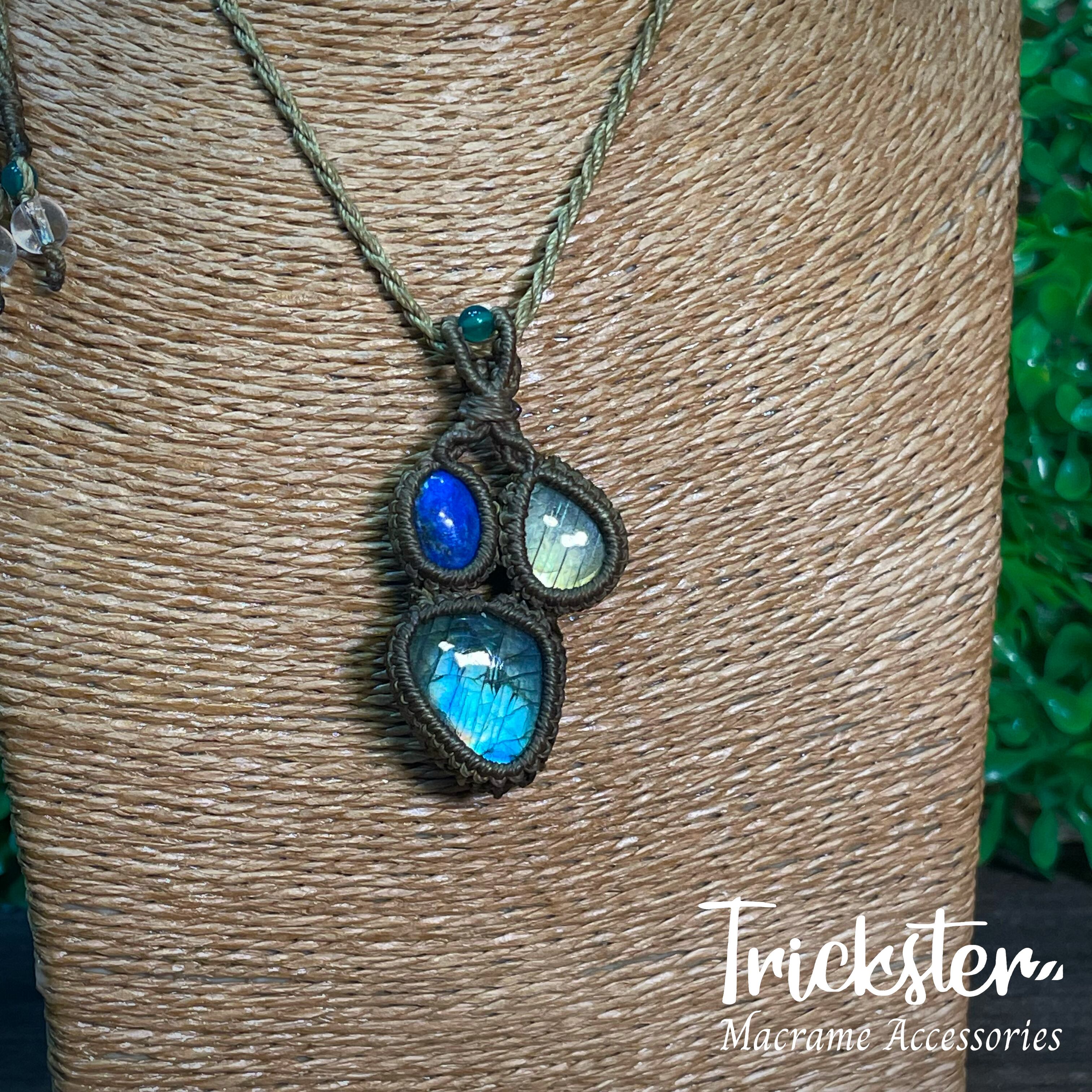 ラブラドライト、ラピスラズリ、グリーンオニキスを使用したマクラメペンダントです。