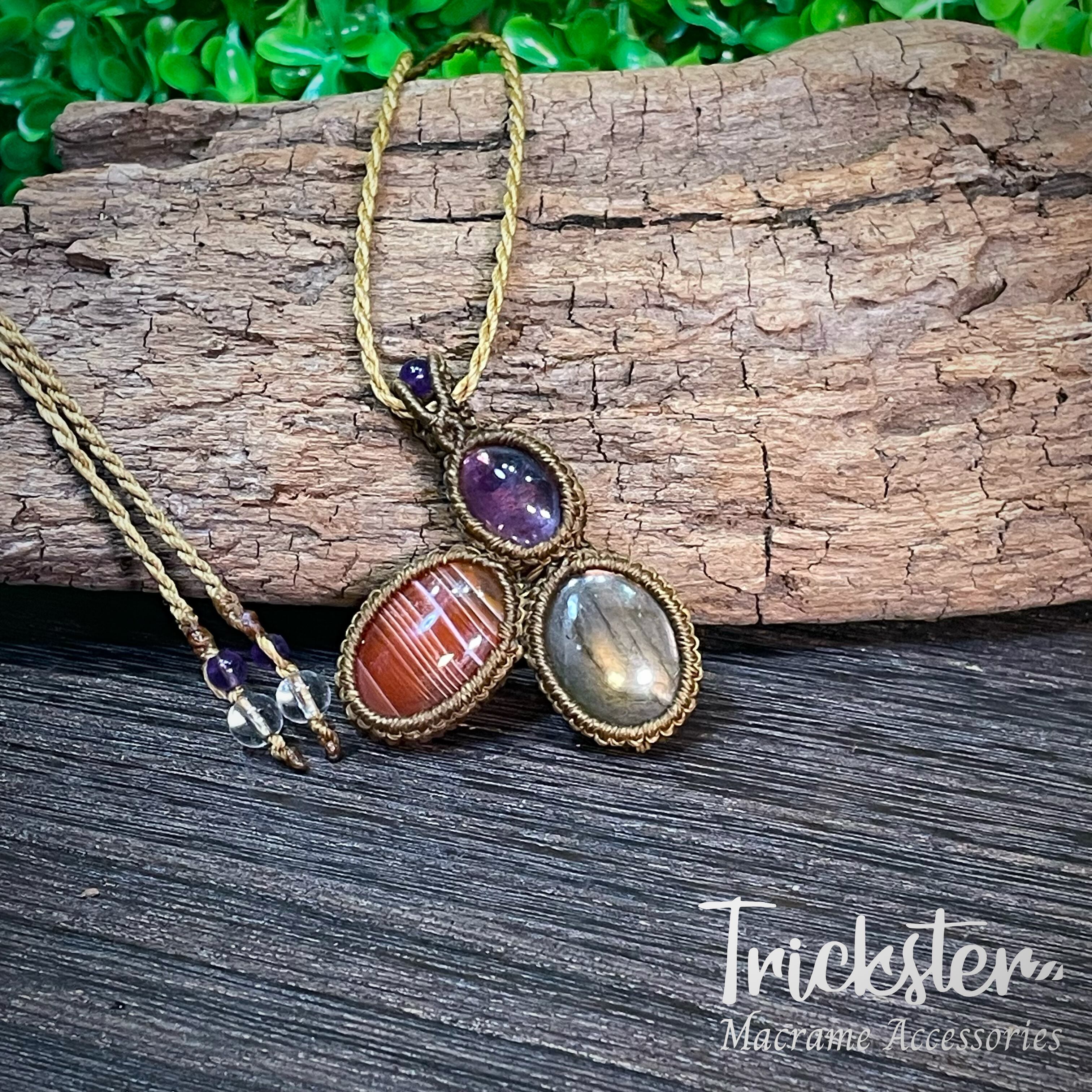 ラブラドライト、サードオニクス、アメジストを使用したマクラメペンダントです。
